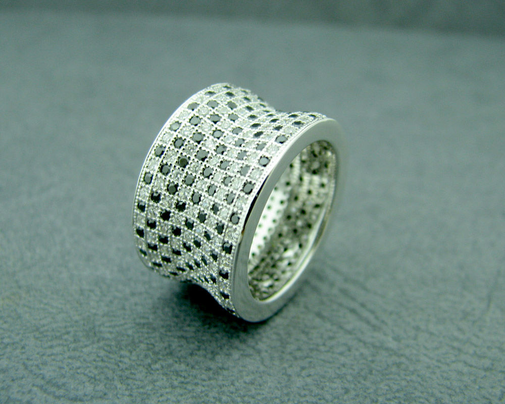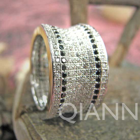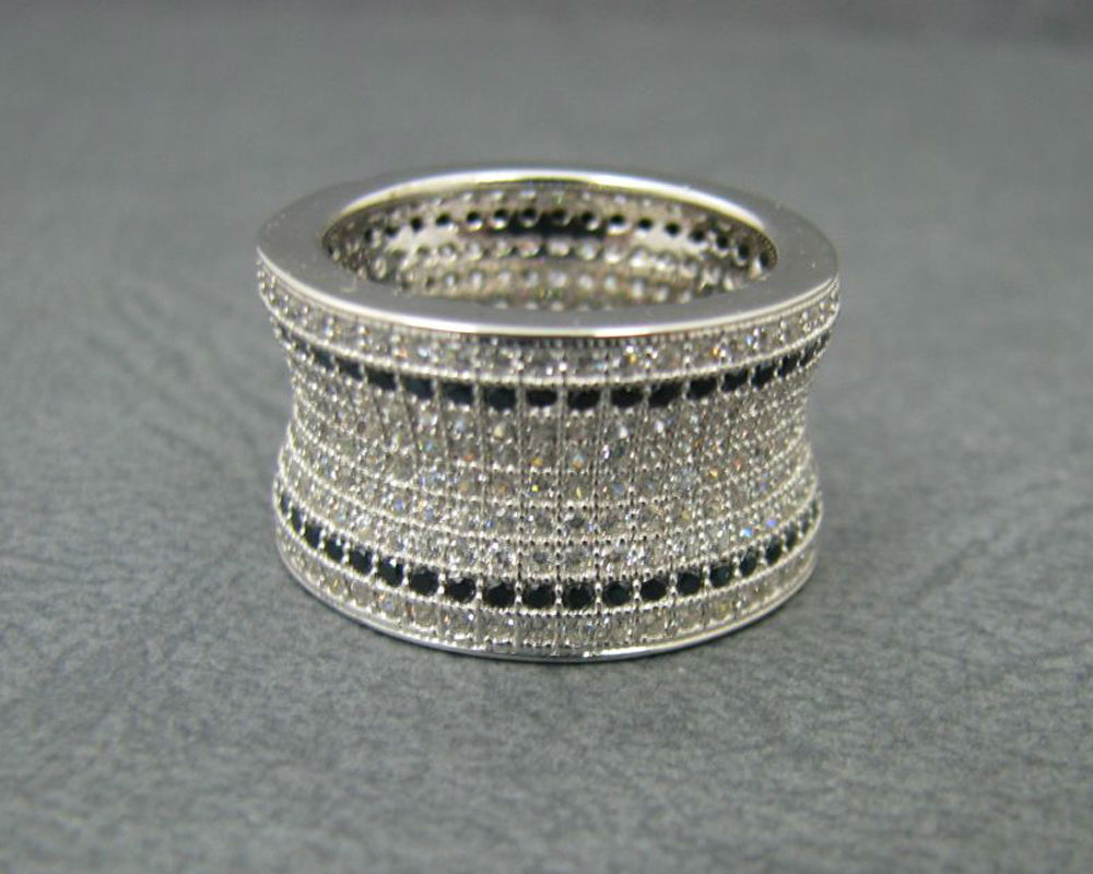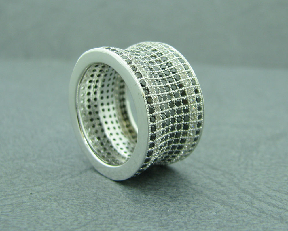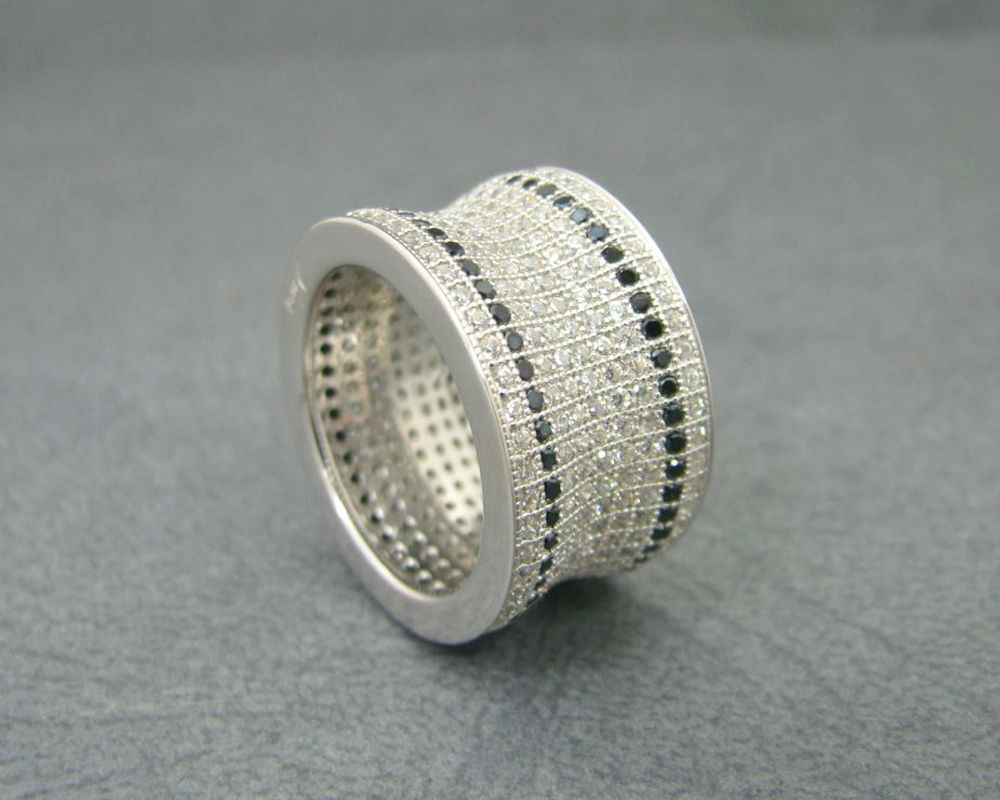 Displayed is an eternity finger ring that is made of silver. The gathered band is fully trimmed with best quality stones. The ring is ideal for any grand occasions.