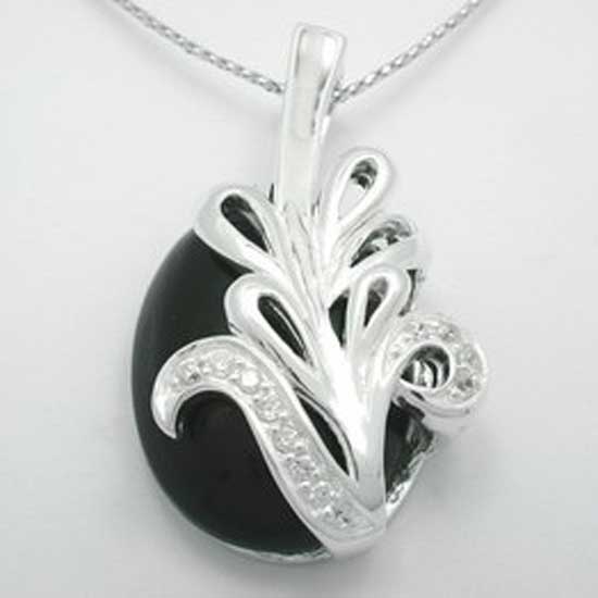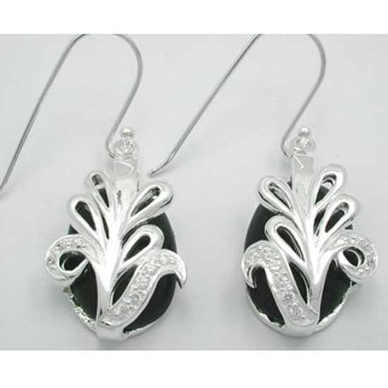 Shown here is a set of silver jewelry that includes a pair of earrings, a pendant and a ring. The set plays with the sharp color contrast of silver and black. The elegant design is completed with black onyx and white CZ stones.
