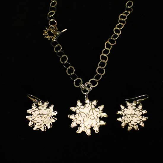 This jewelry set comes with a pair of earrings and a necklace. The unique pattern resembling the sun is eye-catching and sophisticated. This jewelry set has the classical jewelry clasp for added user-friendliness.