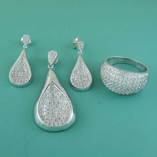 - The pendant and earrings showcase an appealing tear-drop design while the shimmering stone accents offer added extravagance.