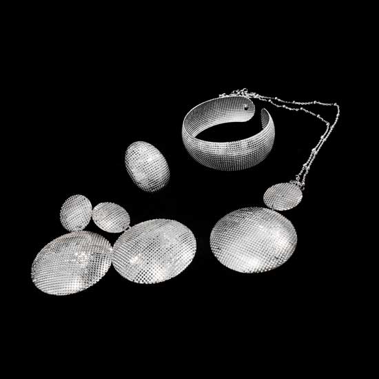 The displayed jewelry set is comprised of a finger ring, a pair of earrings, a necklace and a bangle. Each item is constructed from silver for a dazzling look. The round design looks succinct yet fashionable.