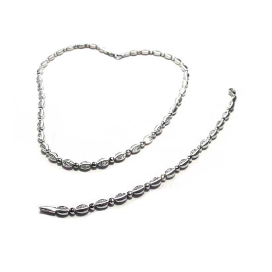 This is a set of jewelry that is made of quality silver with rhodium plating. Each piece is chained with exquisite beads for a neat and elegant appearance. This well-crafted jewelry set makes a great addition to your fine jewelry collection.