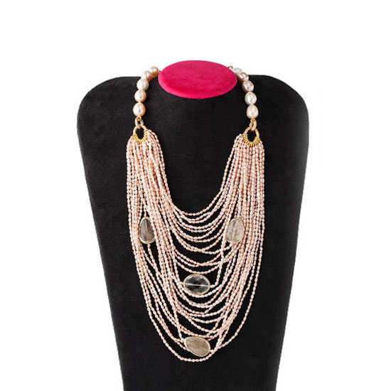 This is a silver necklace decorated with high quality natural stones. It comes with eye-catching strands draping at the front. This tasteful necklace highlights your look effortlessly.