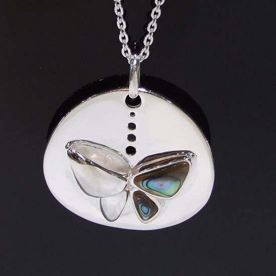 This necklace features a butterfly pattern. The silver piece displays the paua shells that are designed to form a butterfly. One side of its wings is transparent, while the other side is in black, blue and green. Several holes of different sizes are found above the butterfly. The sense of nature released from it is the main reason why this piece is so lovable.
