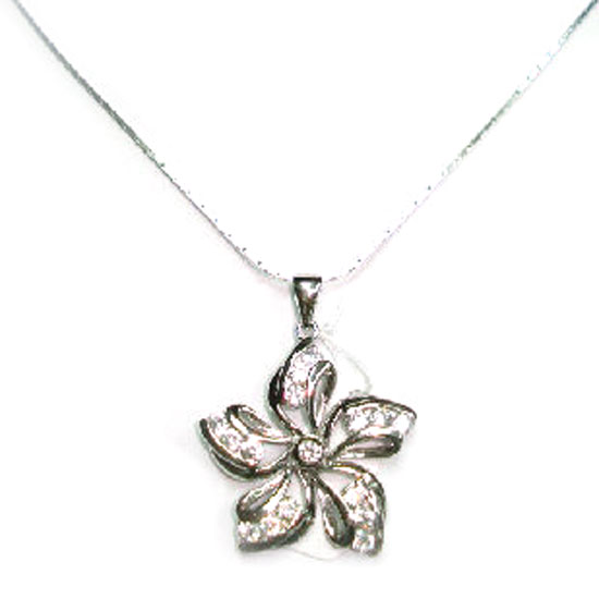 Displayed here is a sterling silver necklace with a flower pendant. The flower pendant is accented with CZ stones for a brilliant accent. This rhodium-plated necklace is easy to mix and match.