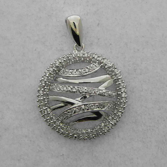 This delicate round pendant features cross-over details inside. The silver jewelry is studded with white CZ stones for added appeal. A polished bail completes the look of this stylish silver pendant.