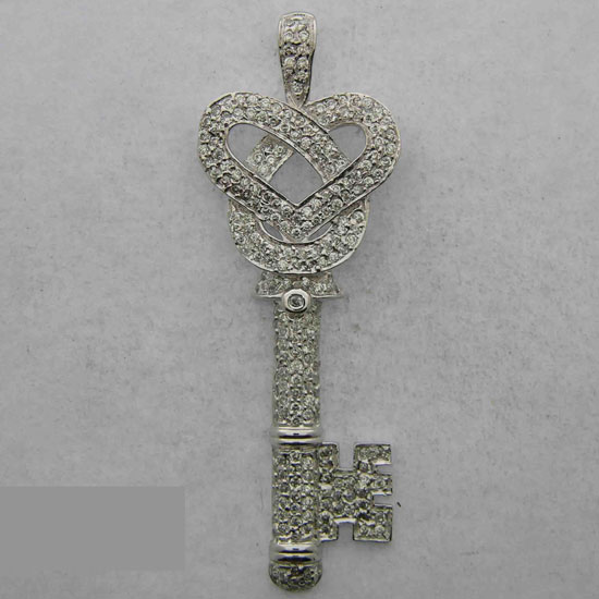 This eye-catching pendant features the design of an antique-style key. The silver pendant is paved with white CZ stones for a shimmering look. It showcases excellent workmanship with refined details.