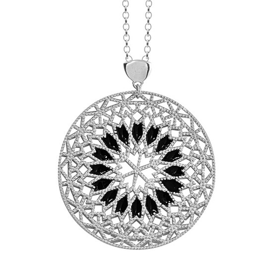 This is a pendant in a round shape with an attractive appearance. It features a sterling silver mounting which is paved with shimmering white stones. The black stones accent this design for added uniqueness.