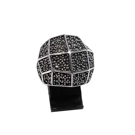 This is a silver finger ring that shimmers with a highly glossy finish. It is fully paved with black circle marcasite stones in assorted silver settings. This simple yet unique finger ring is an ideal addition to complete your jewelry box.