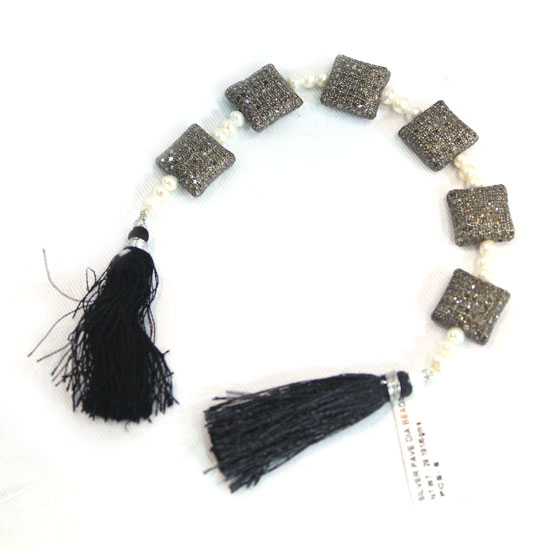 This unique necklace is adorned with diamond-paved silver charms and lustrous white pearls. The black tassel adds interest and flair to the jewelry piece. The eye-catching necklace makes a wonderful accessory for a special occasion.