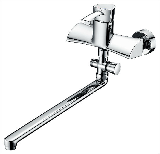 Pictured is an eye-catching bibcock featuring an extra-long and straight spout and two tap holes. Crafting with superior quality material, it is durable and offers a long-lasting serving time. Coming in a space-saving wall-mount design, this bibcock is an exclusive addition to your bathroom.