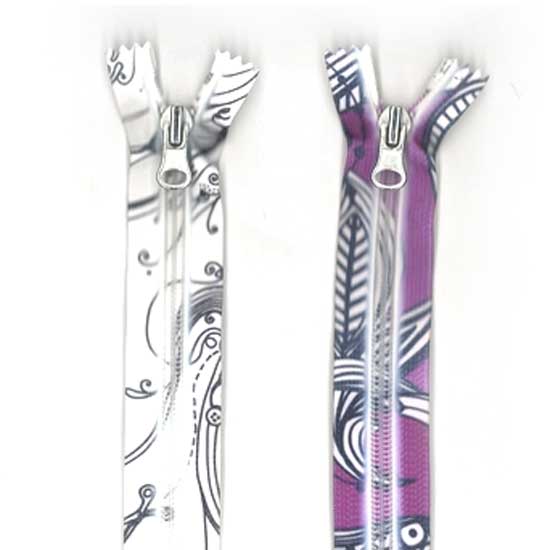 Highlighted is a series of single-slide zippers adorned with fashionable patterns for added style. The quality construction is able to stand daily wear and tear. These chic-styled zippers offer a stylish way to complement your garments and handbags.