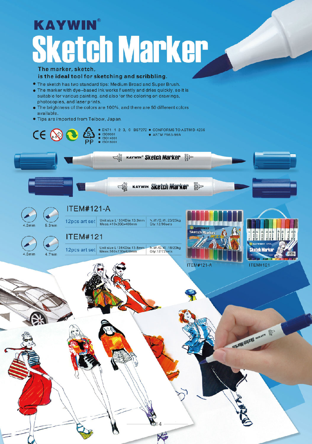 Dual tip sketch markers, 1C silk printing, 12pcs in hard PP box