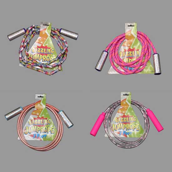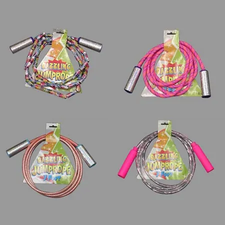 Presented is a skipping rope with colorful and dazzling construction that appeals to young kids. The handles feature a metallic coating to enhance its attractiveness. This lovely skipping rope is a lovely item for group exercise.