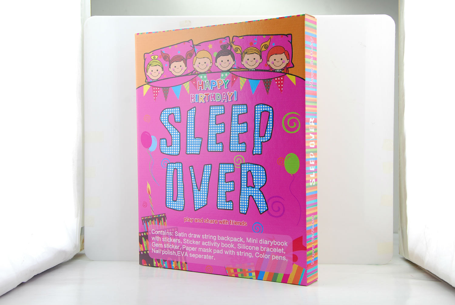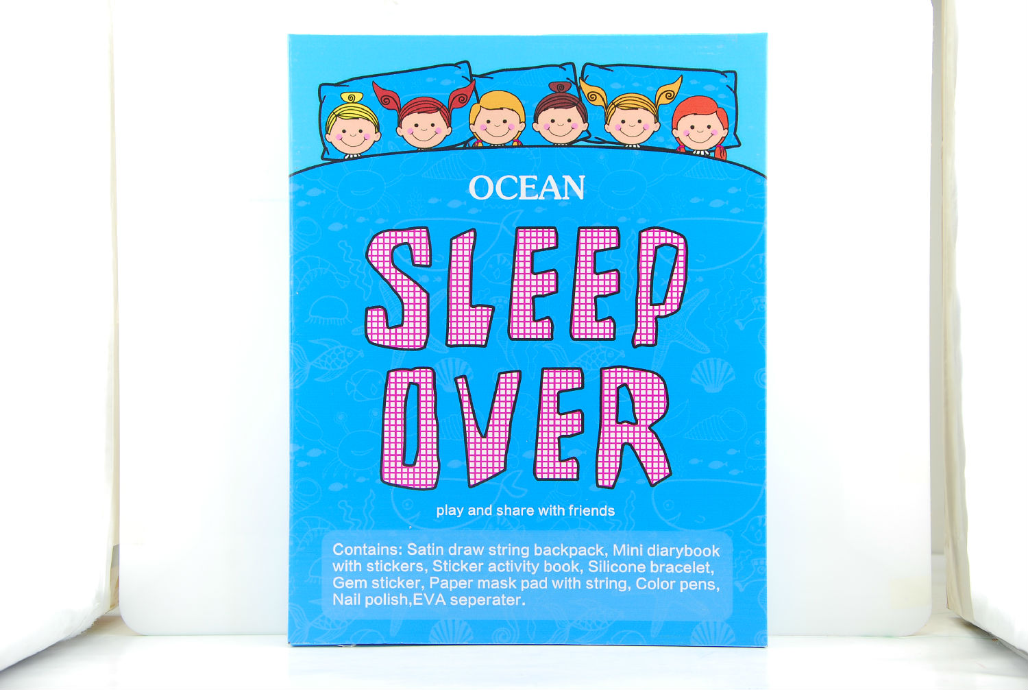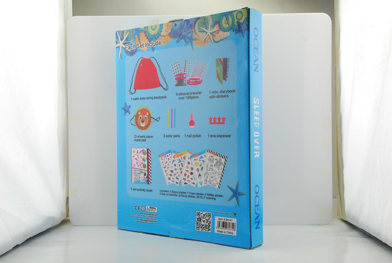each set include:1 satin draw string backpack,1 mini diarybook with 2 sticker,6 silicone bracelet over 100 gems,12 sheet paper mask pad,3 color pens,1 nail polish,1 eva seperaor,1 sheet activitybook