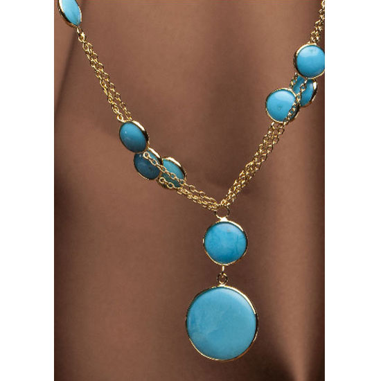 Featured here is an adorable necklace crafted with turquoise from the Sleeping Beauty mine in Arizona. Round discs of gemstones decorate the golden chain casually. The simplistic pendant highlights the wearer's beautiful neckline.