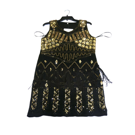 This sleeveless one-piece dress features gold-toned embellishments for an eye-catching look. The hem is decorated with sequins in a tribal pattern. Pair this dress with a denim vest and a pair of ankle boots for a chic, stylish summer look.