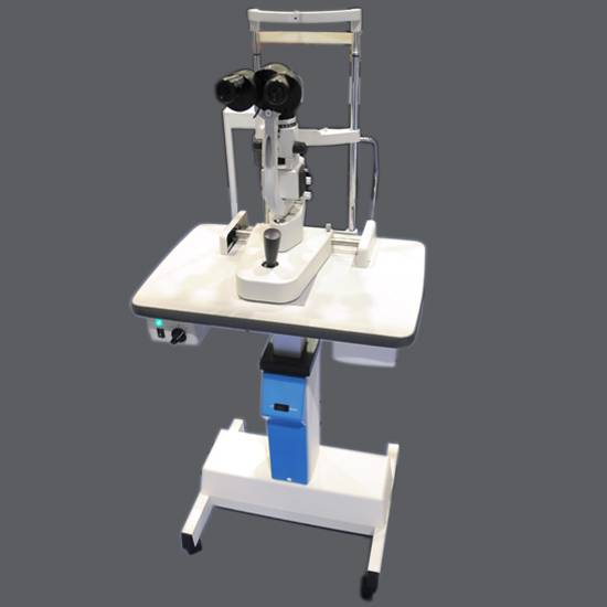 As shown is a slit lamp which helps check eye defects and injuries. This slit lamp can provide a stereoscopic magnified view of the eye structures in striking detail, enabling exact anatomical diagnoses to be made for a variety of eye conditions.