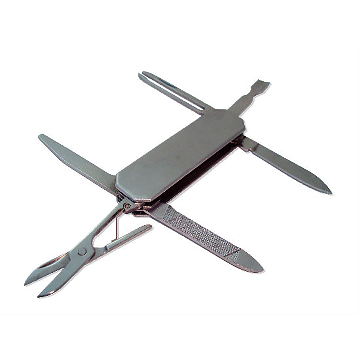 Small multi-function pocket knife includes: scissors, nail file, nail cleaner, mini flathead screwdriver, nail scoop, tweezers, sharp knife blade, small key ring.