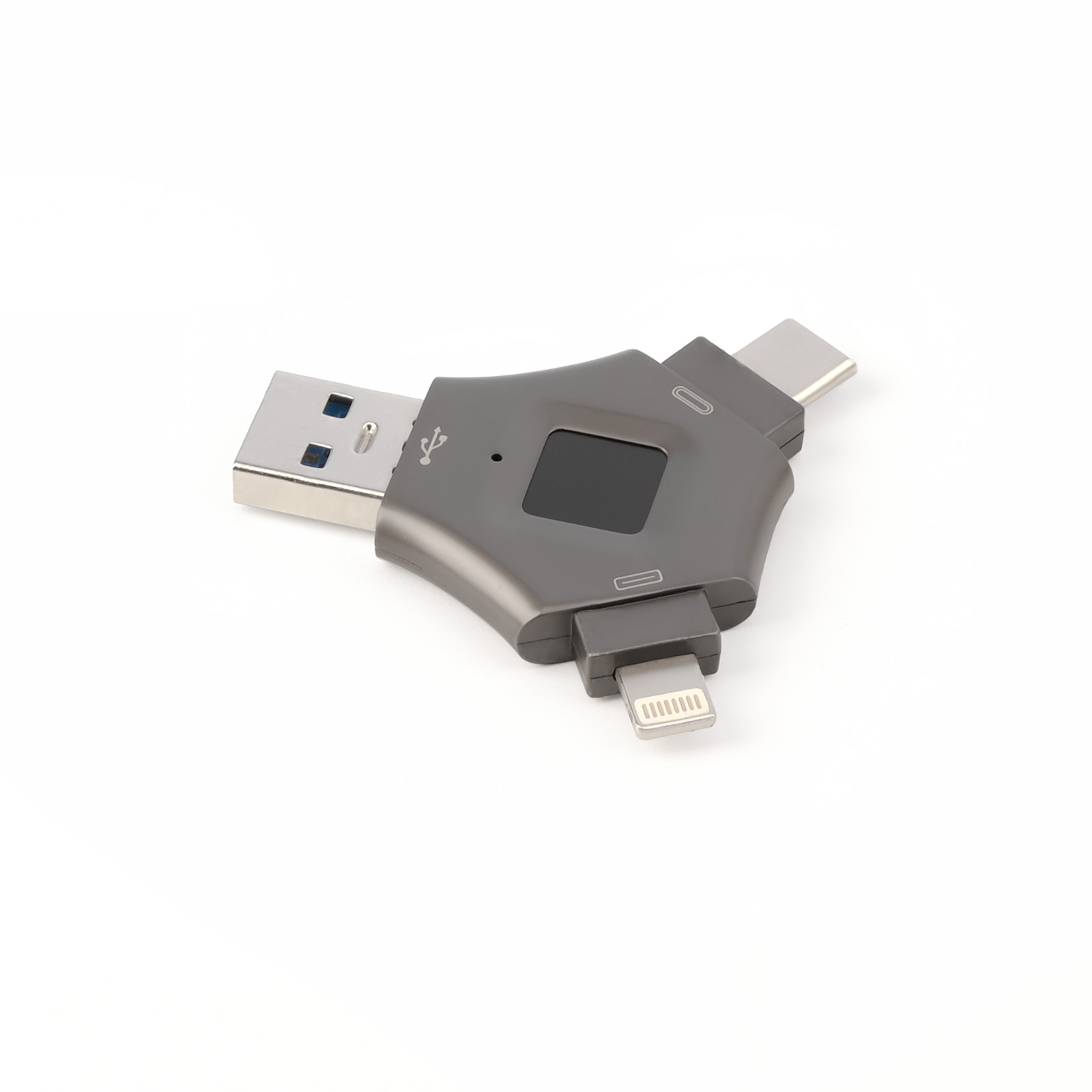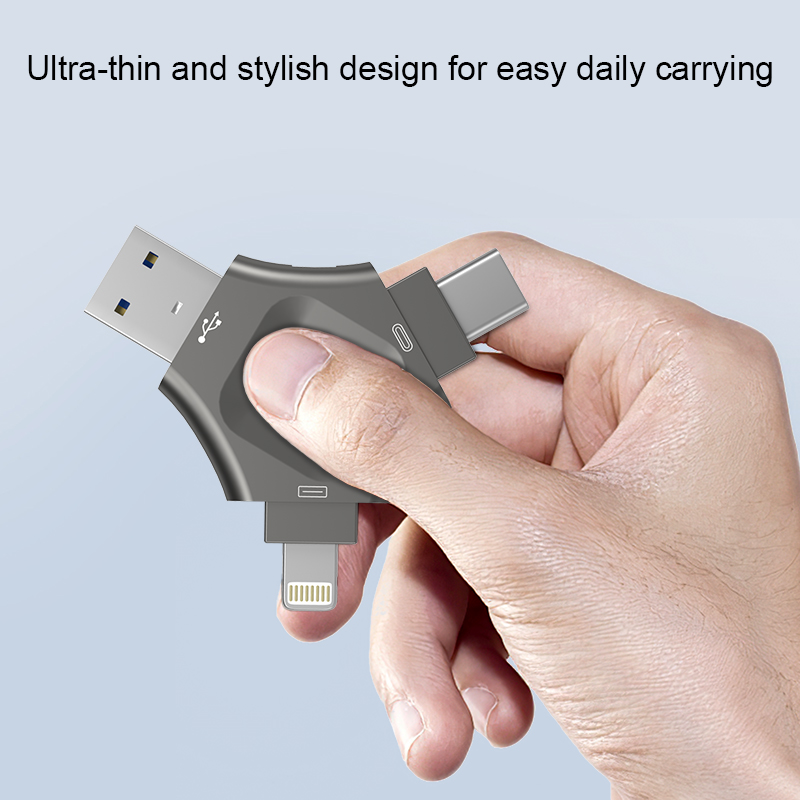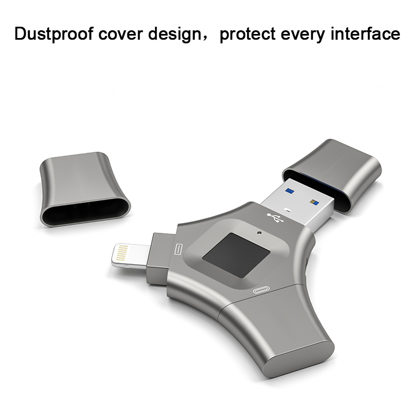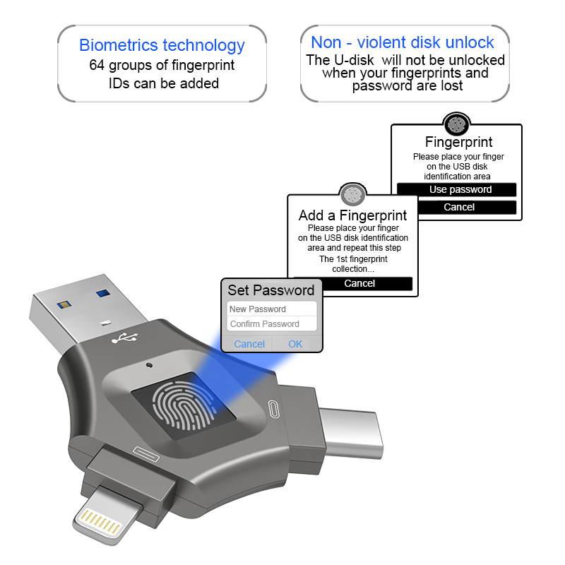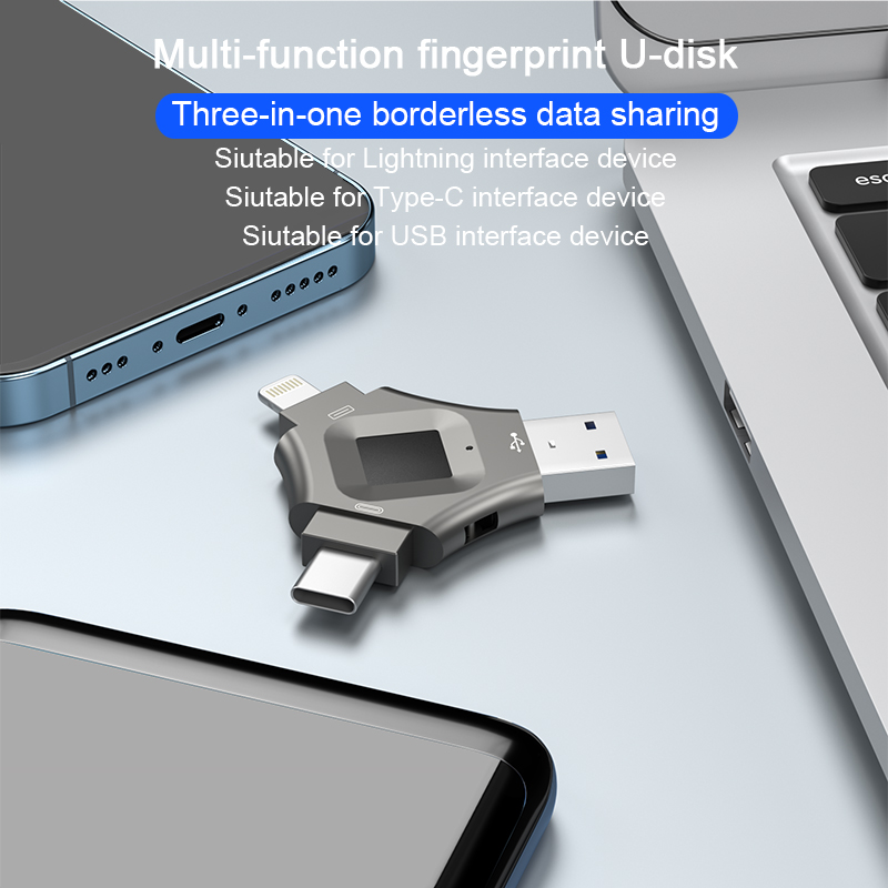 As a professional digital accessories provider, ZOIOT presents this 3-in-1 fingerprint encrypted USB flash drive, designed for seamless cross-device data sharing and secure storage. Featuring Lightning, USB-A, and USB-C triple interfaces, it supports plug-and-play across iOS, Android, Windows, Mac, and Linux systems, enabling fast, stable transmission (10M-30M/s read speeds) for photos, videos, and files. With 360° highly sensitive fingerprint recognition (0.5-second unlock) and full-disk encryption, it safeguards privacy and prevents unauthorized access, supporting up to 64 fingerprint IDs. Crafted from durable metal with a dustproof cover, its compact design ensures portability, making it ideal for protecting personal and business data, catering to cross-border e-commerce, wholesale, and corporate procurement needs.