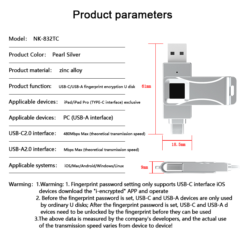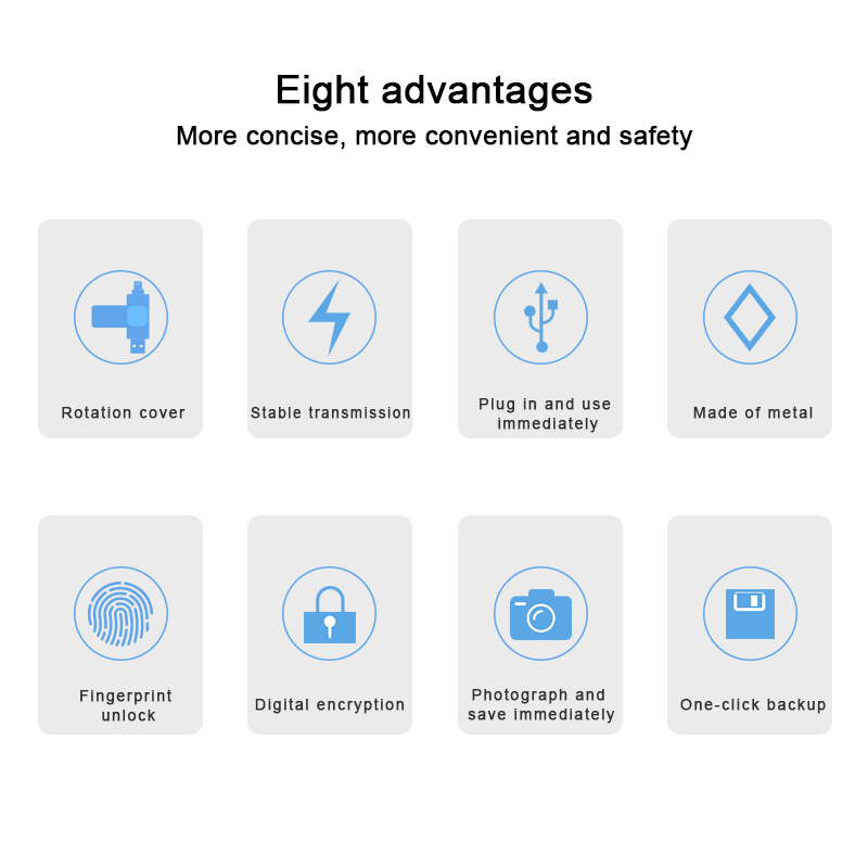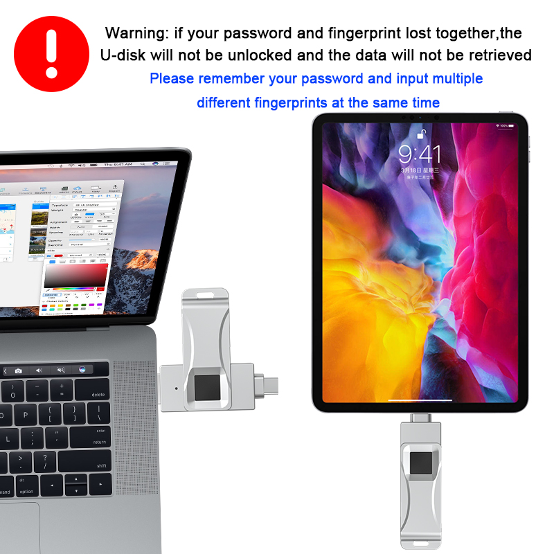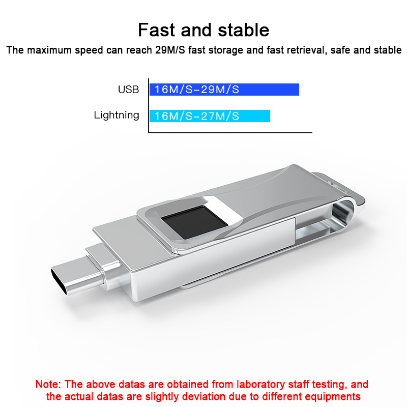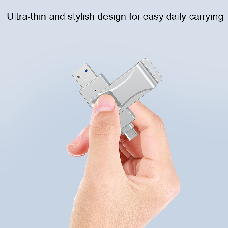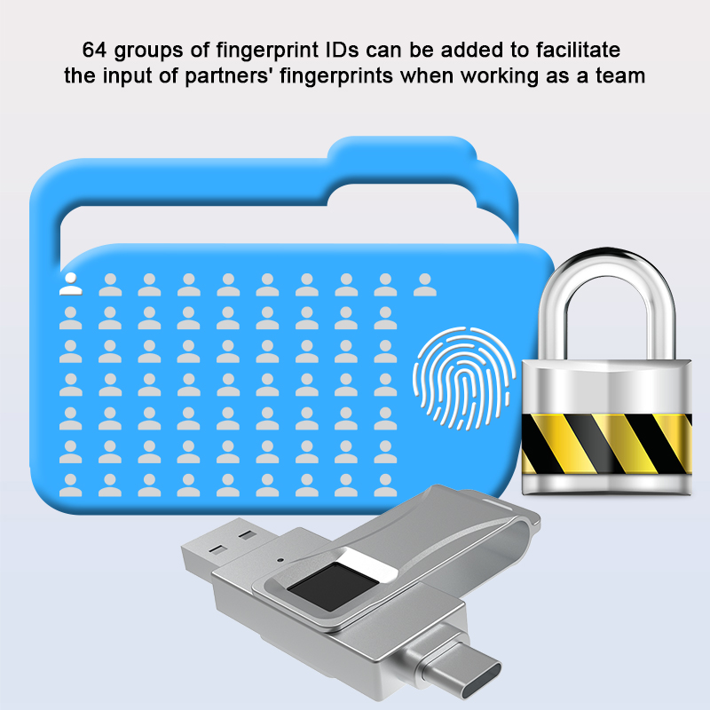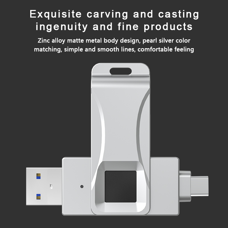 As a professional digital accessories provider, ZOIOT presents this 2-in-1 fingerprint encrypted USB flash drive, designed for secure cross-device data storage and sharing. Featuring USB-A and USB-C dual interfaces (with an optional Lightning adapter), it supports plug-and-play across iOS, Android, Windows, and Mac systems, delivering fast, stable transmission speeds up to 29MB/s. With 360° fingerprint recognition and digital encryption, it offers password-fingerprint dual protection, safeguarding personal and business data from leaks or theft. Crafted from zinc alloy metal with a rotatable cover, its ultra-thin, portable design ensures durability and easy carry. Paired with the exclusive "i-Encrypted" APP, it enables one-click backup and supports up to 64 users, making it ideal for professionals and daily use, catering to cross-border e-commerce and corporate procurement needs.
