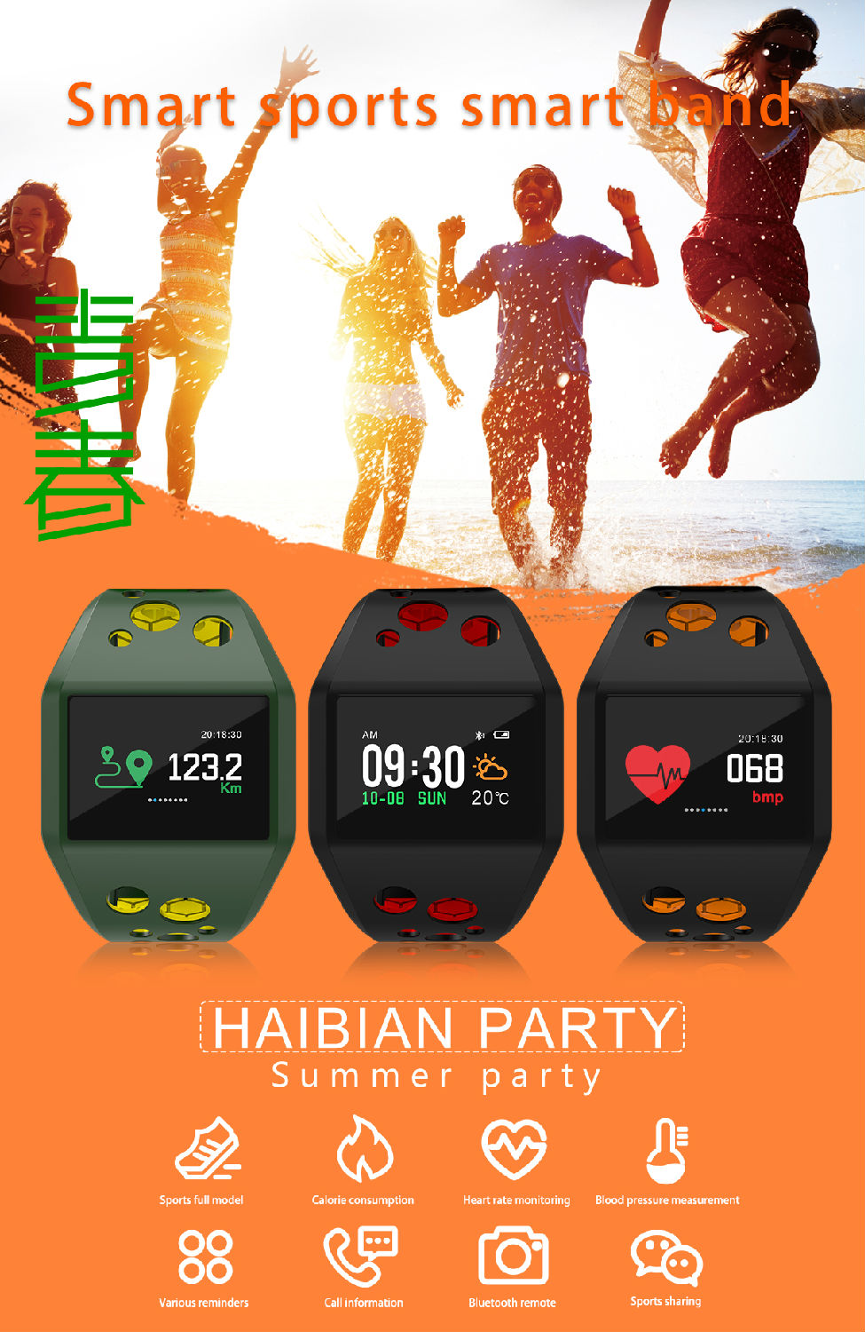 Function: Sports full model, Calorie consumption, Heart rate monitoring, Blood pressure measurement, Various reminders, Call information, Bluetooth remote, Sports sharing