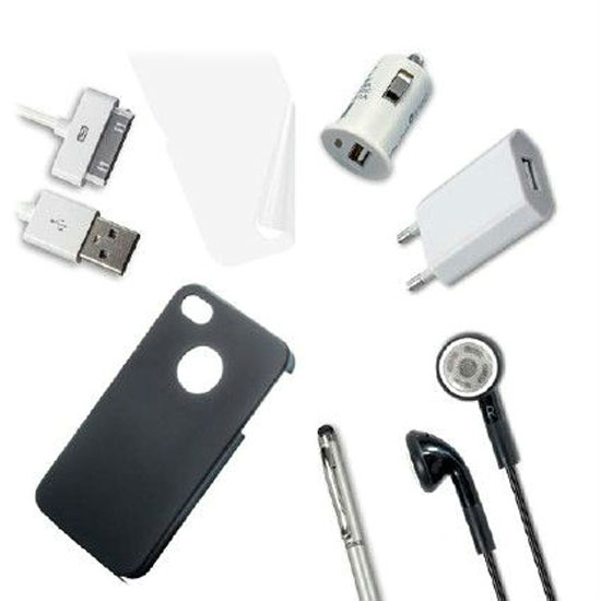 This is a set of accessories for smartphones. It comes with a phone case, a touch pen, an earphone, an adapter, a car charger, a screen protector and a USB cable. Each piece is made with excellent workmanship and attention to detail.