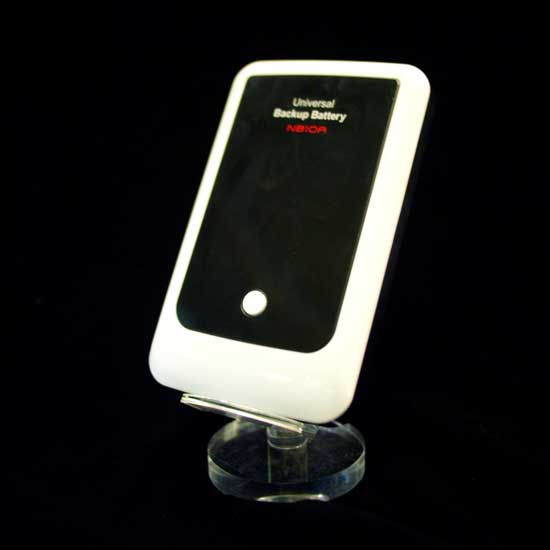This smartphone power bank features a flat rectangular shape in black and white. The compact design allows you to bring it around conveniently. This high-performance gadget is also compatible with iPods and laptops.