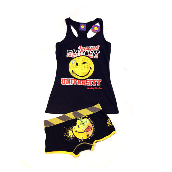 This 2-piece apparel set features a tank top with Y-shaped back and a matching pair of comfortable shorts. The iconic yellow Smiley face is added on the two garments. This fancy set is great for everyday occasions.