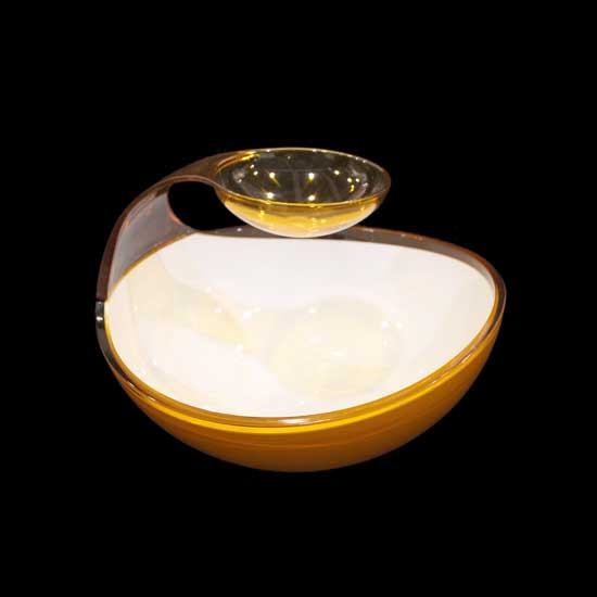This snack bowl features a round-shaped body in an orange color. The snack bowl is designed with a top container for dipping sauce. It is a wonderful choice to serve assorted snacks at parties and family get-togethers.