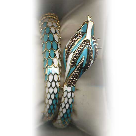 This stylish bangle comes with a snake design for a fashionable touch. It is crafted with hot enamels on the 18kt gold setting for added glamor. This charming bangle makes a pretty way to complement your chic look.