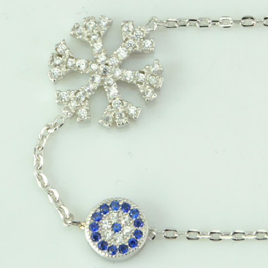 Glam up your wrist with this sterling silver chain bracelet. When playful elements crush with fashion, the uniqueness of this jewelry will definitely take your breath away. The shimmering snowflake and the lovely ball adornments are perfect match, without outshining the beauty of one another. Embellished with royal blue and icy white gemstones, this captivating snowflake bracelet adds a touch of elegance to your look and might just be the missing piece that you need to enhance your style. Hesitate no more and add this item to your jewelry collection.