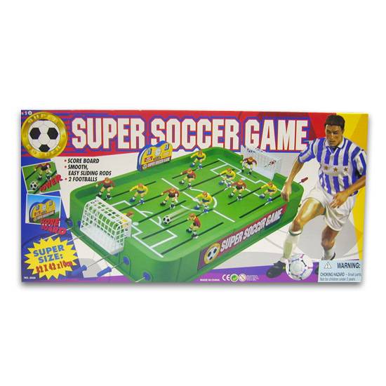 This is a soccer game that is packaged in an attractive box. It is a miniature foosball game and is primarily made of plastic.