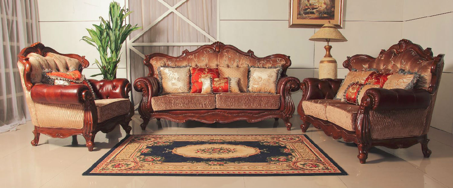 Choose this sofa set for an antiquated look at home with luxury. Embellished frame with legs partners handsomely studded cushions to provide supportive and wide seating. Its curved armrest design furthers its indulgent comfort with undeniable vintage flair.