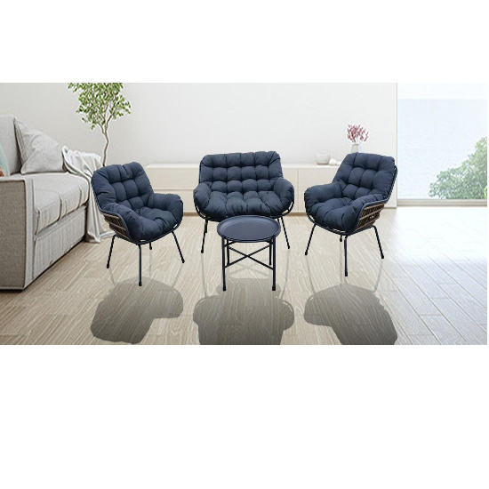 Sofa set:Steel frame with powder coating , with 12mm round wicker weaving , with spun polyester cushion 10cm in seat and back , table with stainless steel plate