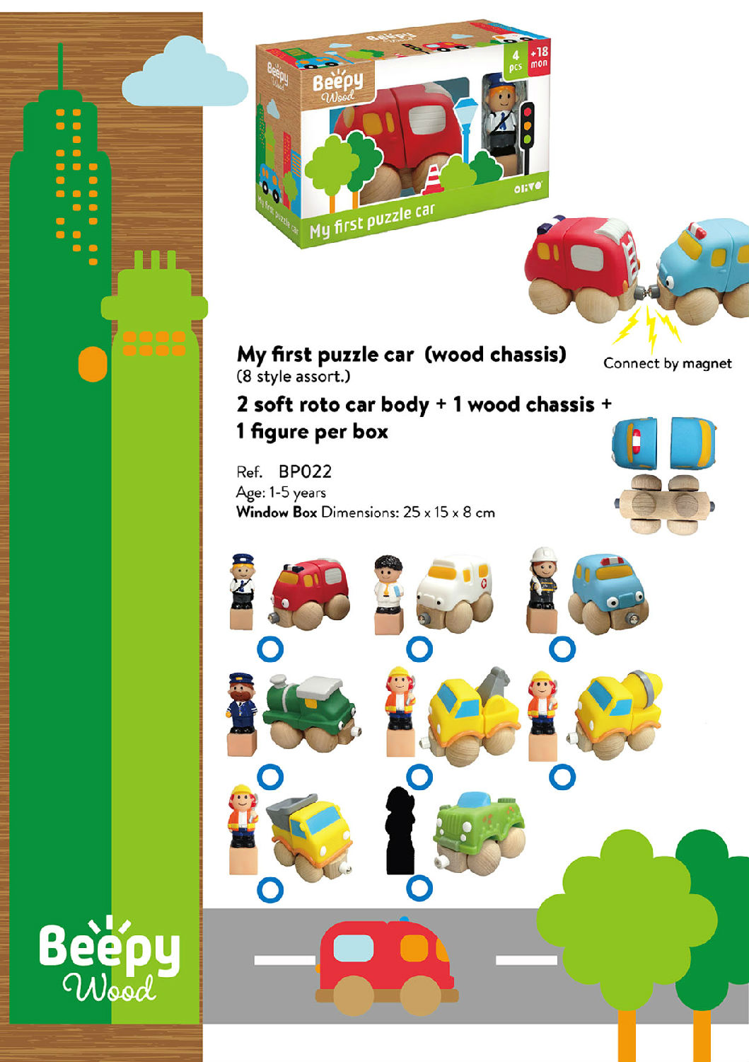 Soft puzzle vehicles: - each set including one puzzle vehicle and one figure - self assemble vehilce - soft roto car body + free wheel wood chassis - play with figure