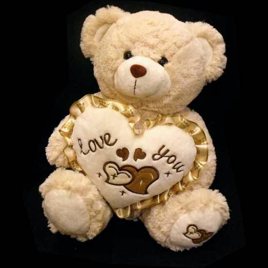This featured item is a soft stuffed teddy bear toy made of plush. A soft heart-shaped cushion is included. This product is an excellent item for your kid's bed.