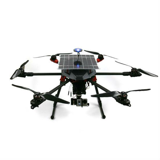 Featured here is a solar powered drone for aerial photography use. It comes in a six-axis structure and has a solar panel on top. This drone is equipped with a compact camera at the bottom for capturing high quality images and videos.