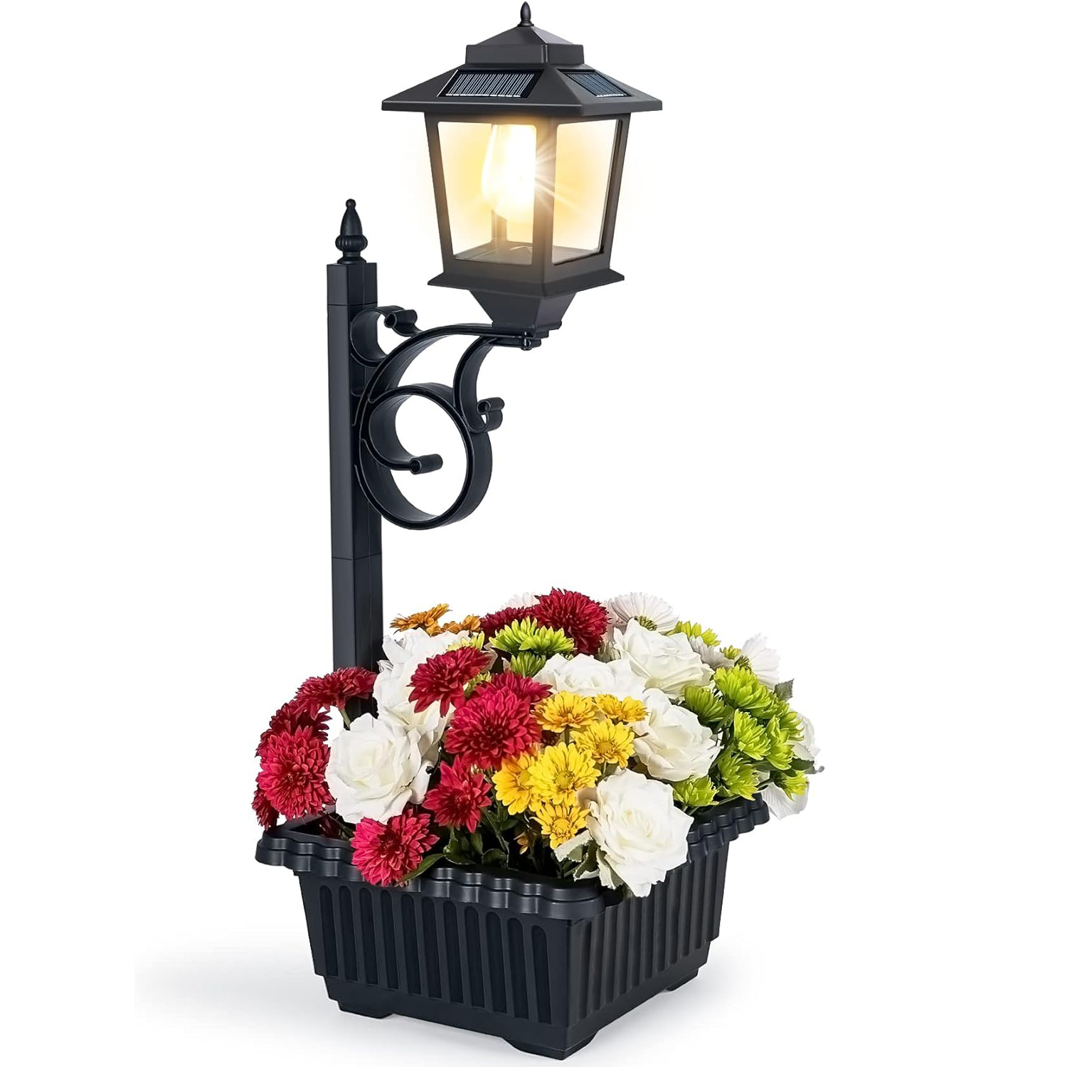 Perfect for outdoor decoration, this solar lamp post with planter brightens your garden, yard, or patio, making it ideal for Halloween and other festive holidays. The flowerpot base holds fake or artificial flowers for a maintenance-free decorative touch, suitable for daily use and seasonal celebrations