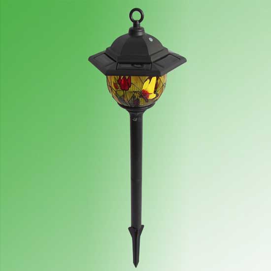 This classy black lawn light spotlights a yellow light shade with colorful butterfly and flower patterns. The solar-powered lawn light is a perfect lighting source for gardens, parks and other green areas. The pointed pole and wireless design allows it to be easily placed anywhere in the garden.