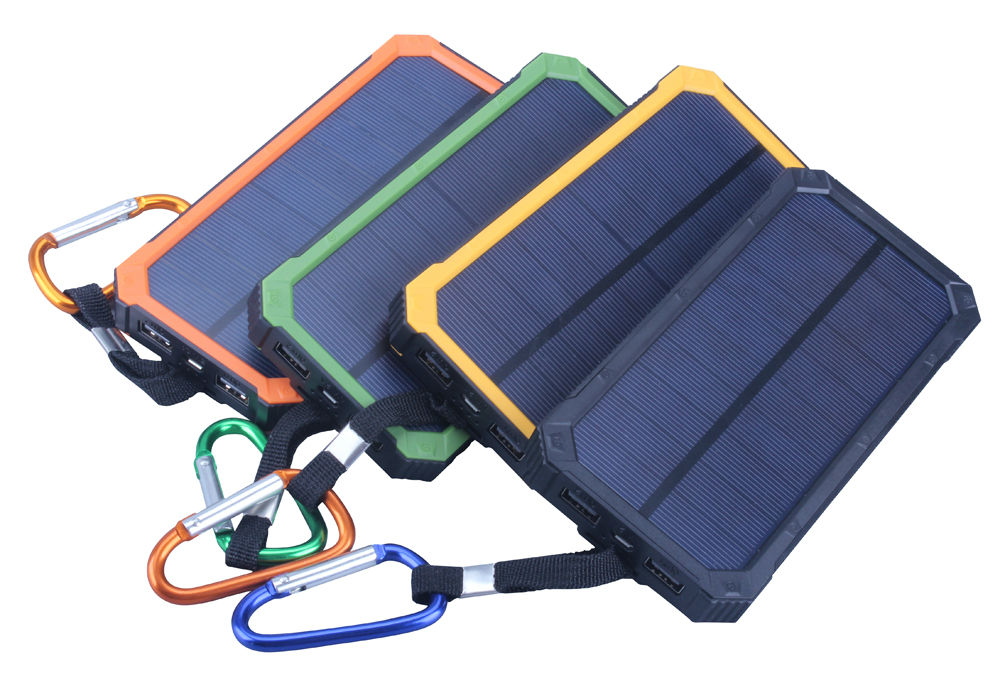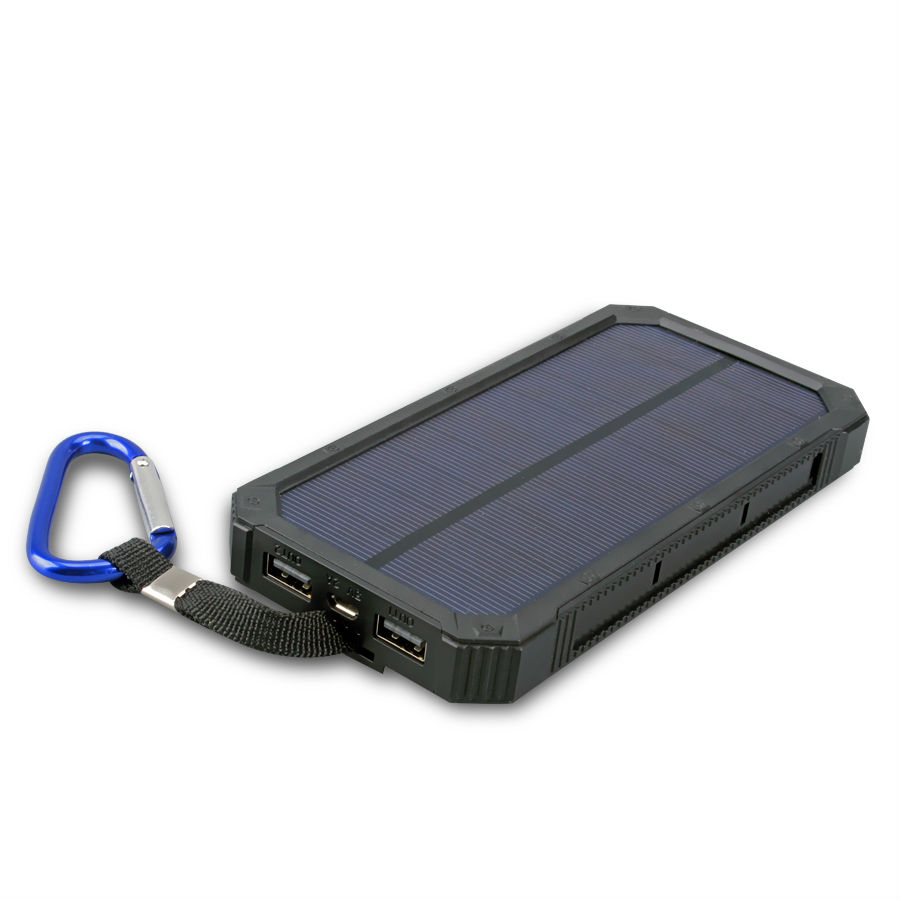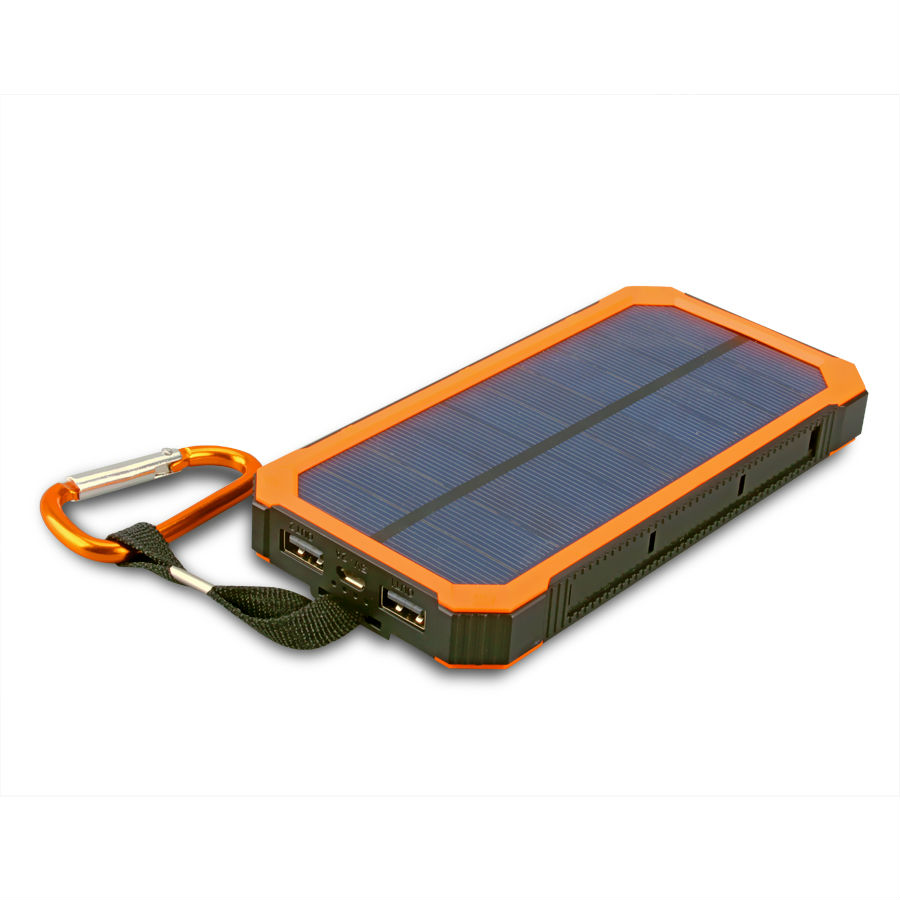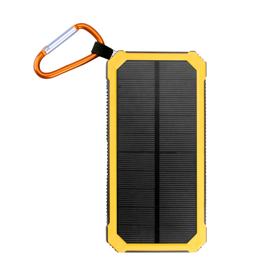 Highlighted here is a solar powerbank with a 10000mAh capacity. It comes in a compact rectangular design and has a solar panel at the back. This powerbank has two USB ports for charging and is attached to a carabiner for carrying convenience.