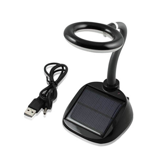 This LED desk lamp features a solar panel on the base. It can also be powered by computers through connection with the USB cable. The simple and modest design in black is great for both households and offices.