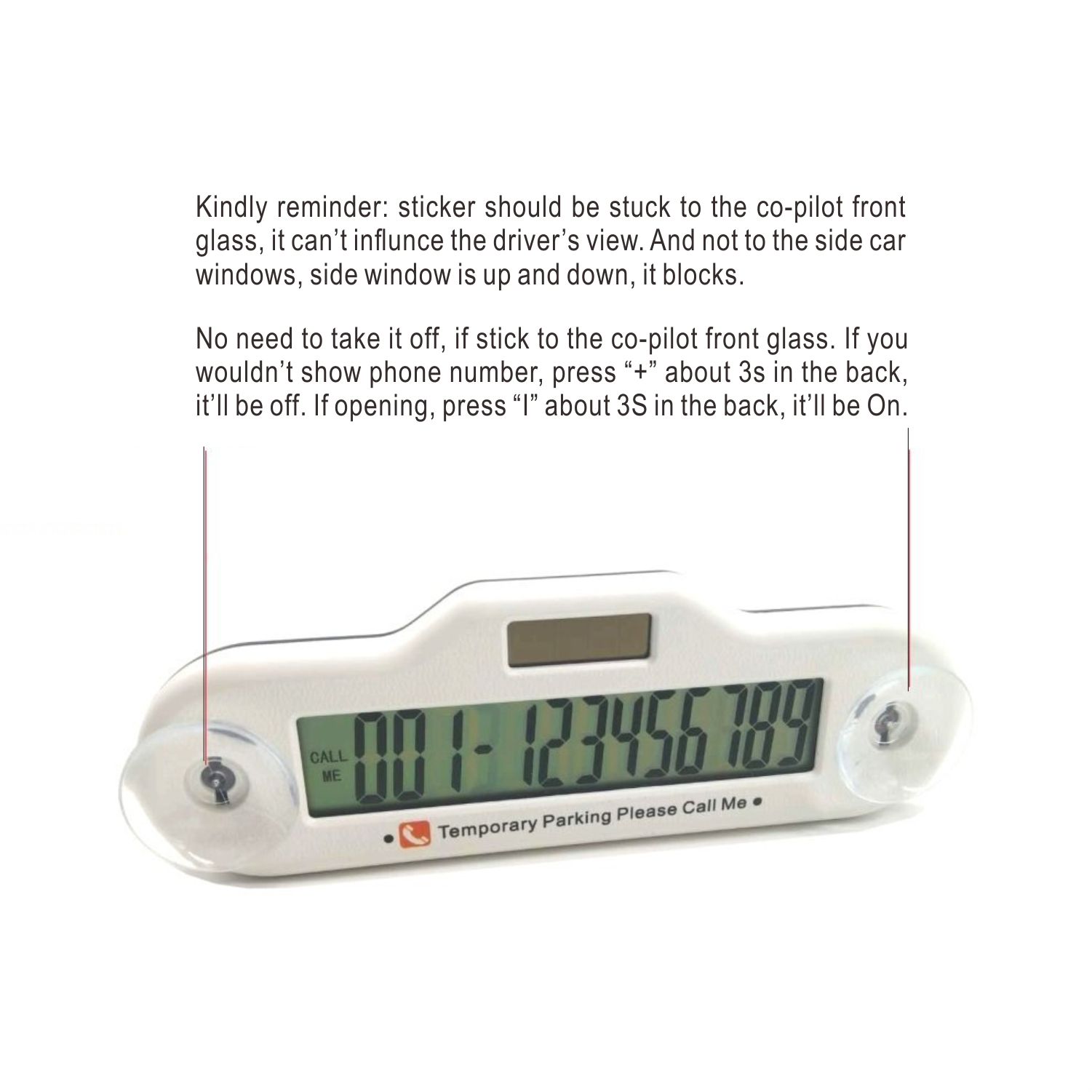 Kindly reminder: Sticker should be stuck to the Co-pilot front glass, it can't influence driver's view. And not to the side car window, window is up & down, it blocks. If stick to the Co-pilot front glass, no need to take it off as usually. You can press "+" 3s in the back, it'll be On/Off.