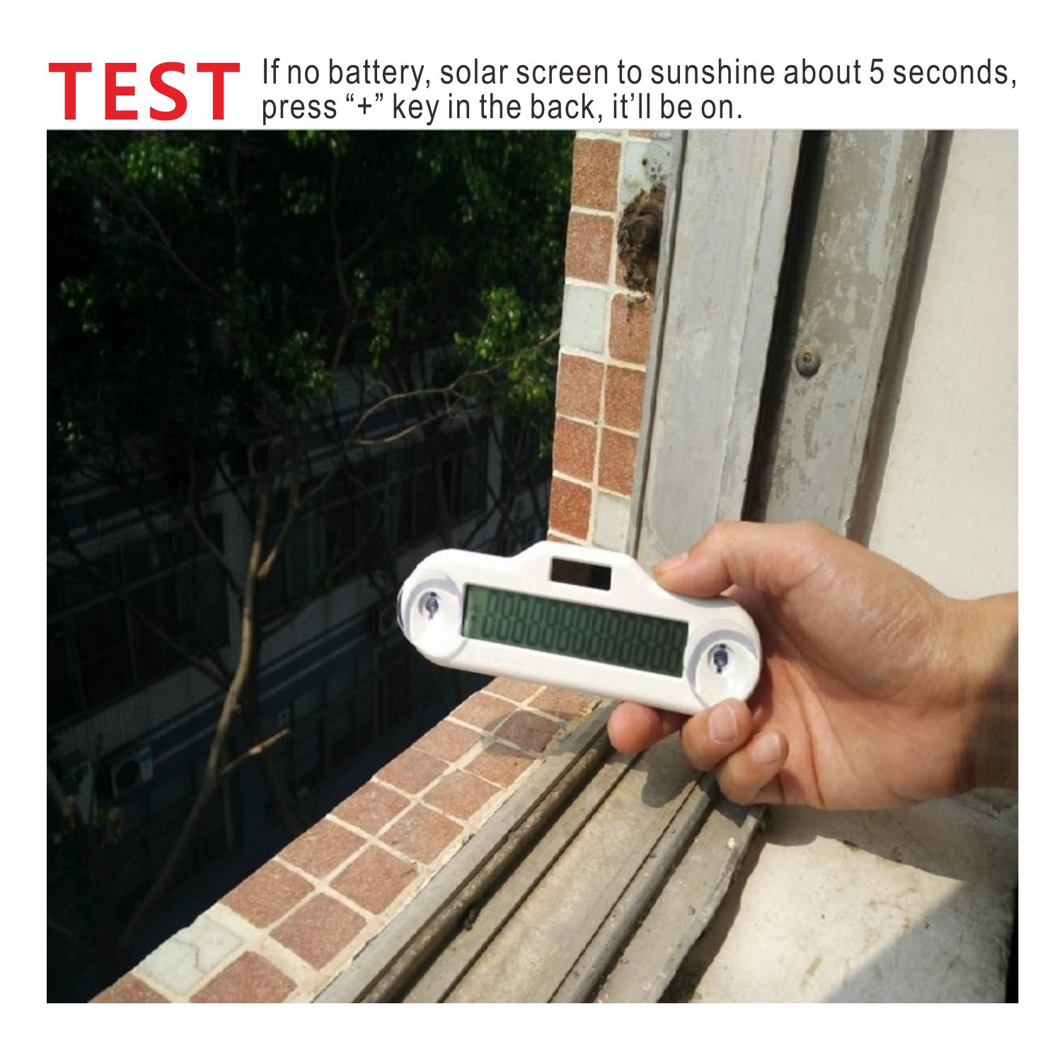 Power supply: Solar + Battery, Solar first while the sun is shining. We test without CR2032 battery, when the sun shines within 5 seconds, you can press the "+" key in the back, it'll be on. By the way, we provide CR2032 battery in equipment.