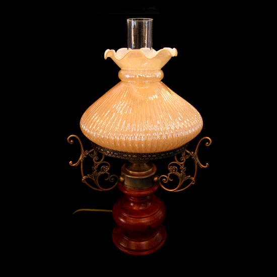 Pictured is an elegant desk lamp crafted with wood, glass and other materials. The openwork design on the base foregrounds the oriental design. The pale lampshade delivers soft and even lights.
