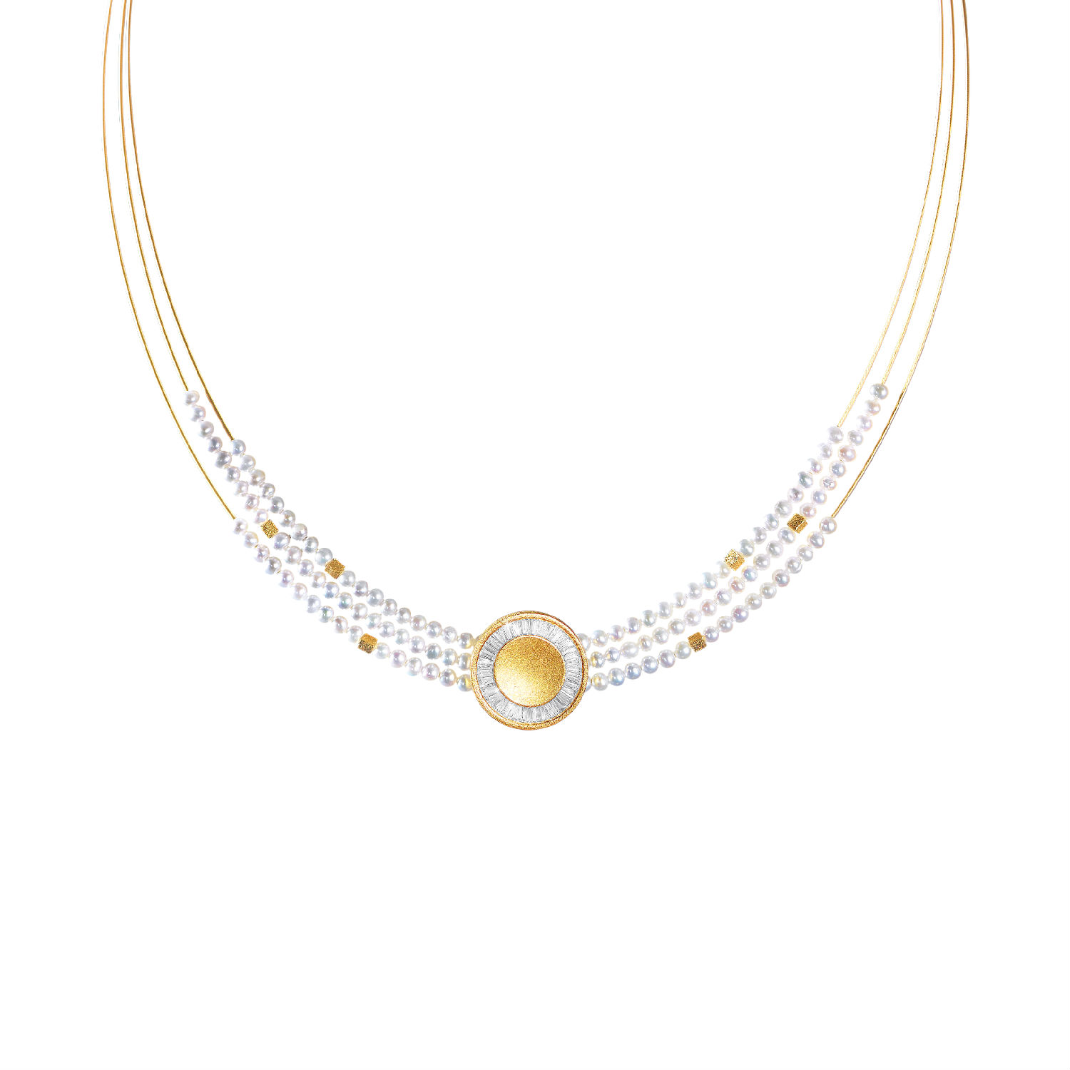 Arranged in a sunburst pattern, sparkling baguette-cut zirconia scintillates with the wearers every movement, while the concave golden surface in the middle reflects the light with a magical shimmer and small, exquisite freshwater pearls exhibit an appealingly elegant luster.
