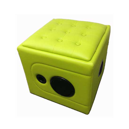 Displayed is a sound cube that comes in a bright green color for a playful style. With a Bluetooth connectivity, this sound cube can easily help you adjust sound volume for your better enjoyment. This high quality sound cube comes with a control panel with a power switch.