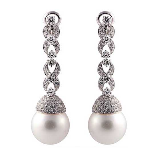 This is a pair of earrings that features a large white south sea pearl as the center piece. Crafted of 18K white gold, each earring is beautifully accented with brilliant diamonds in the multiple links. This pair of earrings showcases a luxurious and elegant touch to its appearance.