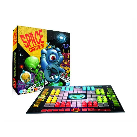 This space checker combines the luck of dice with the strategy of checkers. Four races of aliens have discovered the earth. All of them want to invade the planet and they are not interested in sharing. The races agree to decide the matter in a space showdown. The winner takes all, with earth as the prize. Players capture opponents’ flying saucers by jumping over them. The first race to collect any 10 ships wins the game.