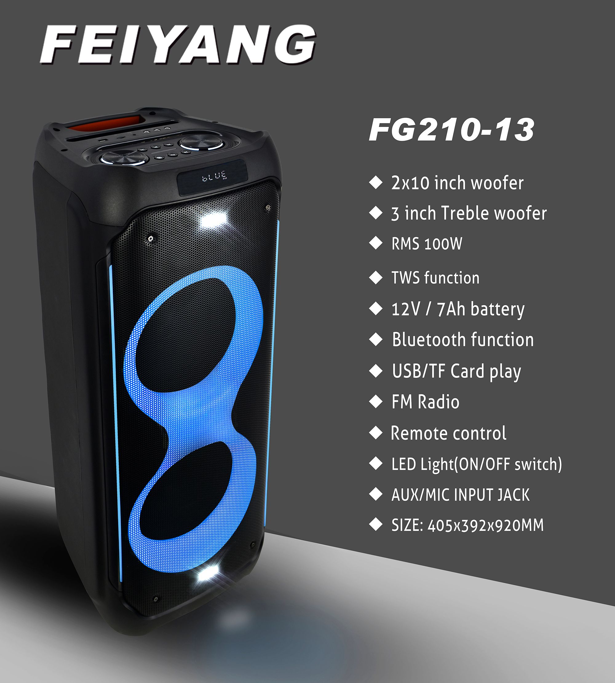 Record/12V , 7A lead acid battery /AUX Input /Light on woofer / EQ/ 2 Mic input/Guitar input / English Voice broadcast/ 12V/wheels /RMS:100W